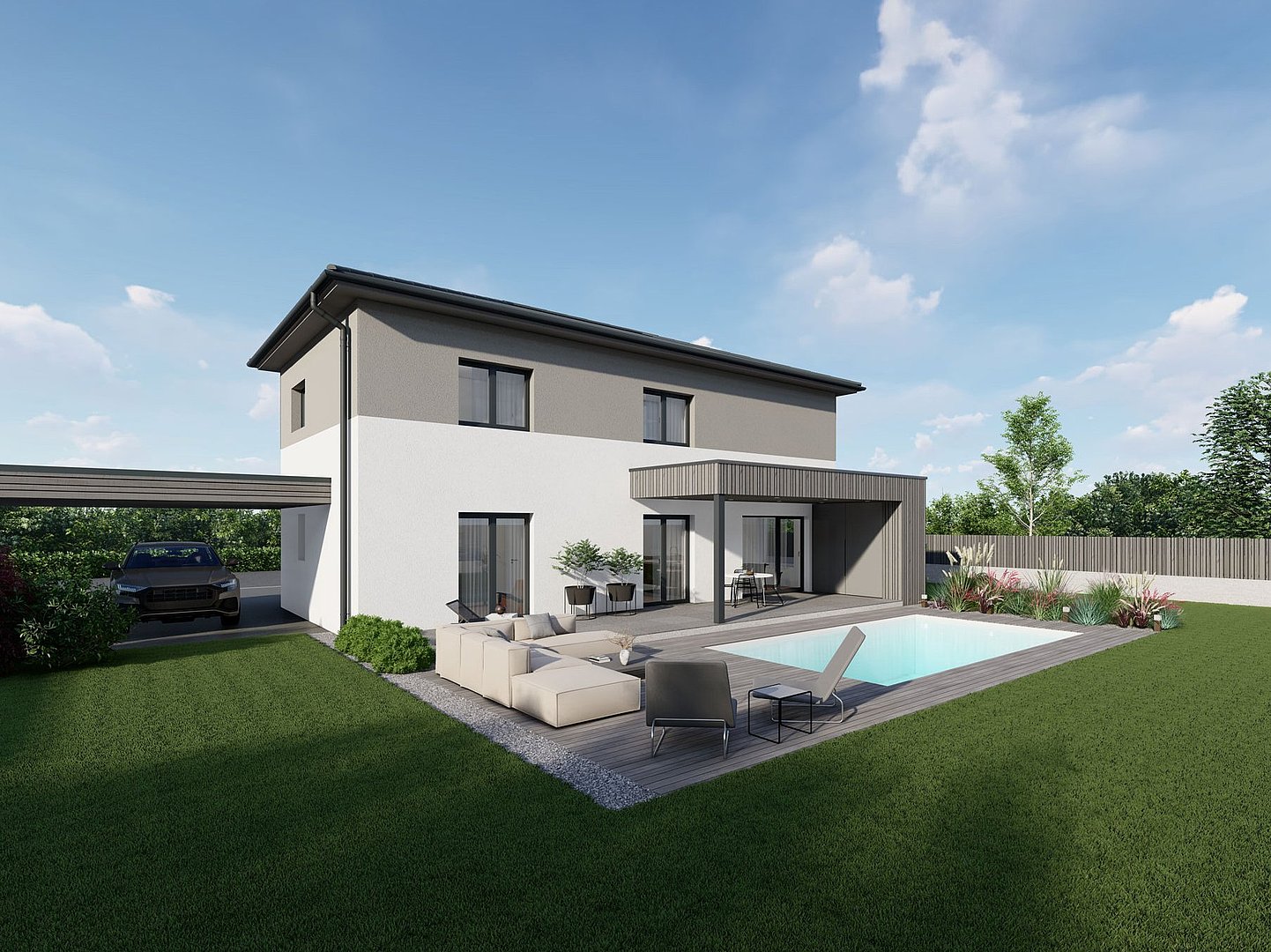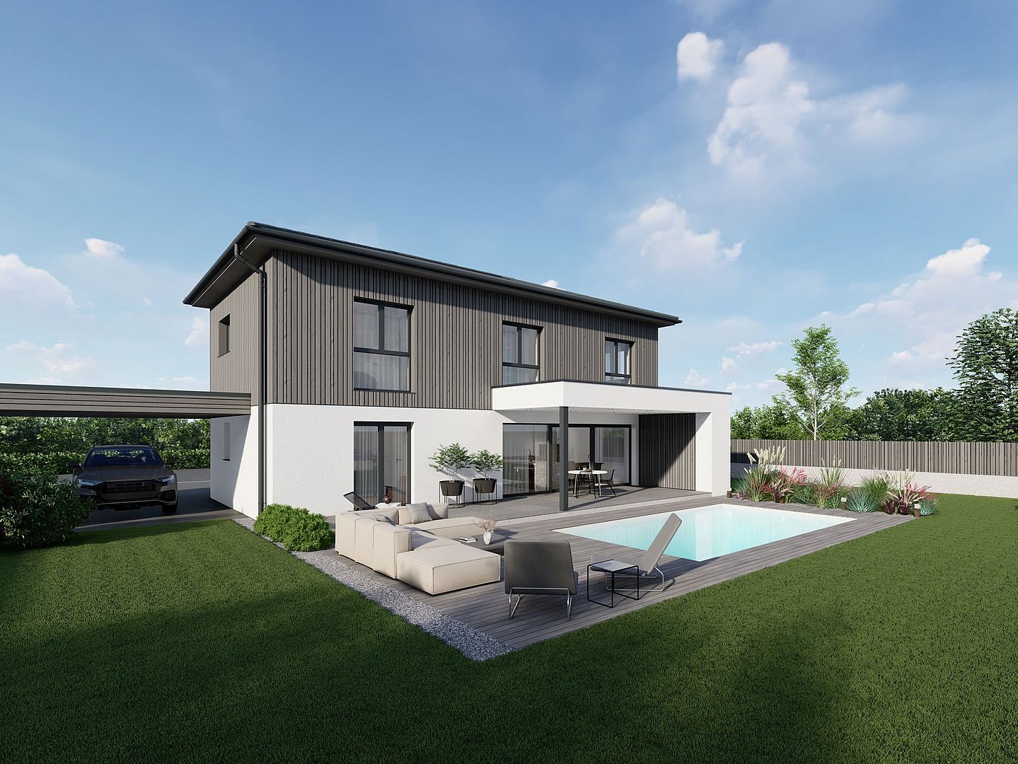 Das Aktionshaus SIMON wurde fĂźr modernes Familienwohnen auf zwei Ebenen konzipiert. GroĂzĂźgige, helle Räume und eine offene Gestaltung sorgen fĂźr ein angenehmes WohngefĂźhl. HerzstĂźck ist der groĂzĂźgige Wohn-Ess-Koch-Bereich, der zum gemeinsamen Leben einlädt. Zwei Kinderzimmer, ein Gästezimmer/BĂźro sowie das Schlafzimmer mit Ankleide bieten viel Platz fĂźr Familie und flexible NutzungsmĂśglichkeiten.