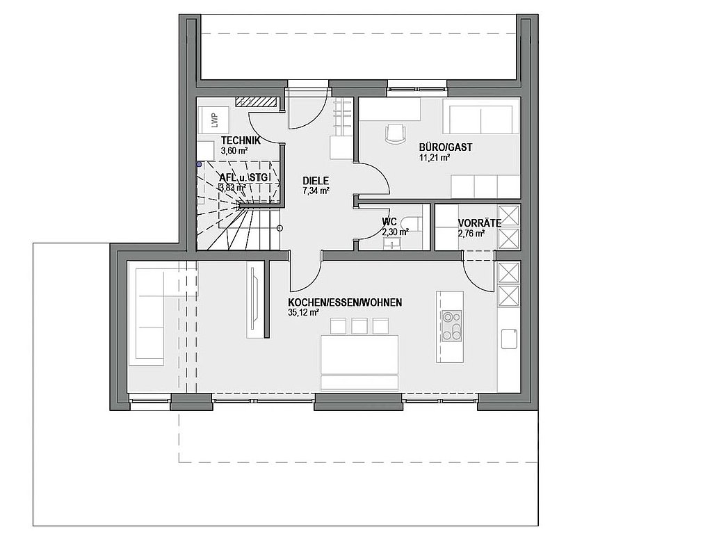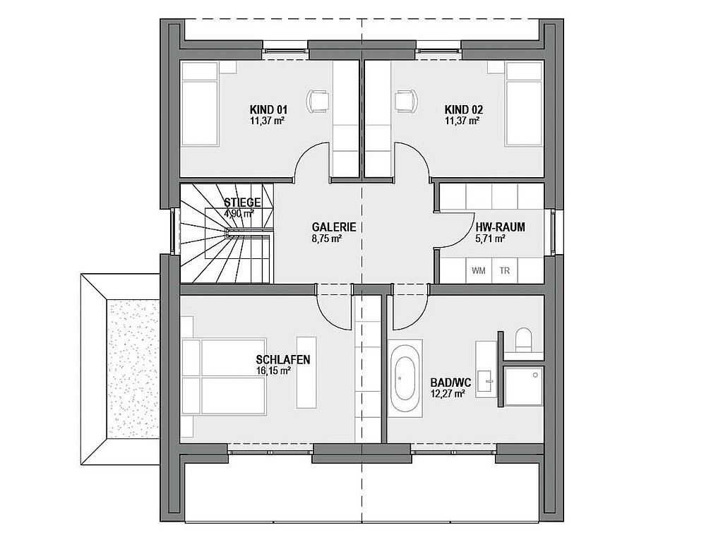 Unser Bregenz 133 überzeugt mit klaren Linien, großen Fenstern und einer eleganten Eingangsüberdachung. Der offene Wohn-Essbereich mit Küche führt direkt in den Garten. Zwei helle Kinderzimmer, ein modernes Bad sowie das Schlafzimmer mit Schrankbereich bieten höchsten Komfort.
