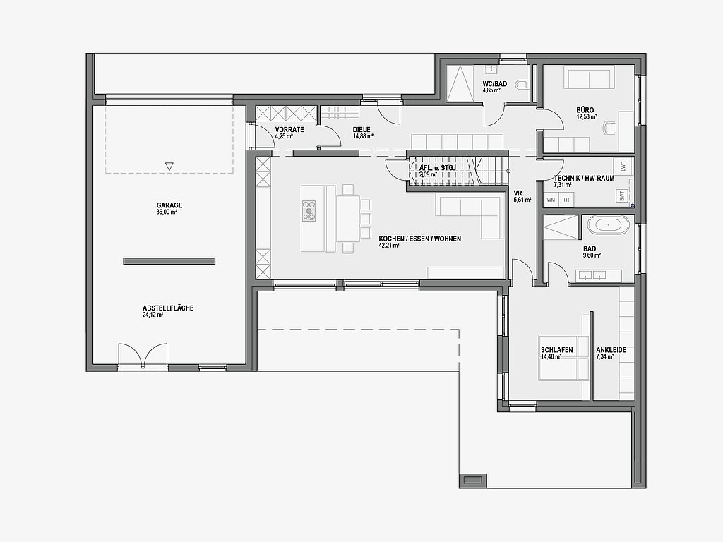 * Bauzone 1, Oberösterreich; Haus mit Flachdach; außen schlüsselfertig; innen belagsfertig inkl. Bodenplatte und Streifenfundamente; Außenwand mit 25 cm WALLMENT-Ziegelfertigwänden und 20 cm Vollwärmeschutzfassade; WINDOWMENT®-Kunststofffenster; VIESSMANN-Luft-Wasser-Wärmepumpe; komplette Elektro- und Sanitärrohinstallation; Estrich; Innenputz;
