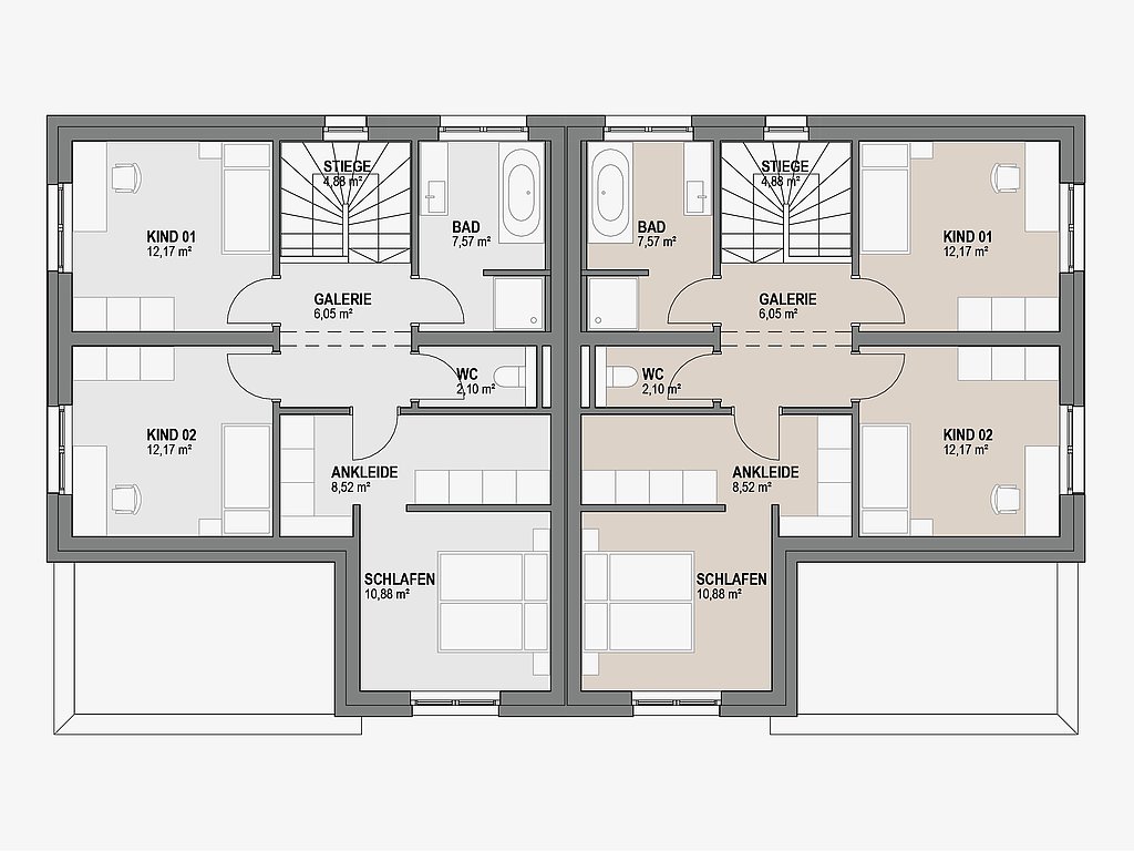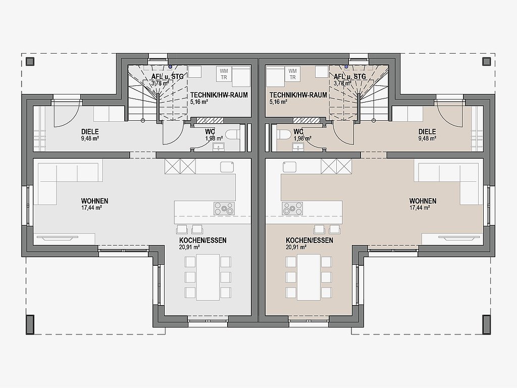 Mit einem Doppelhaus teilen Sie sich mit den Bewohnern nebenan die Grundstücks- und Baukosten. Diese Art des Hausbaus erlebt derzeit einen regelrechten Boom. Ein Doppelhaus können Sie sich auch mit Ihrer Familie teilen und somit ein Haus für Generationen errichten. Im 54,97 m² großen Erdgeschoß gibt es einige Wohn-Highlights zu entdecken: Der L-förmige Wohn-Ess-Koch-Bereich hat unglaubliche 38,35 m² und erzeugt mit Garantie bei Ihren Besuchern einen Wow-Effekt. Des Weiteren beherbergt die Doppelhaushälfte im Obergeschoß eine Badeoase zum Entspannen sowie drei Schlafzimmer – davon ist eines mit angrenzender Ankleide ausgestattet.