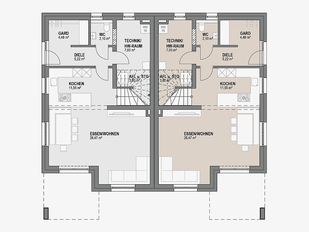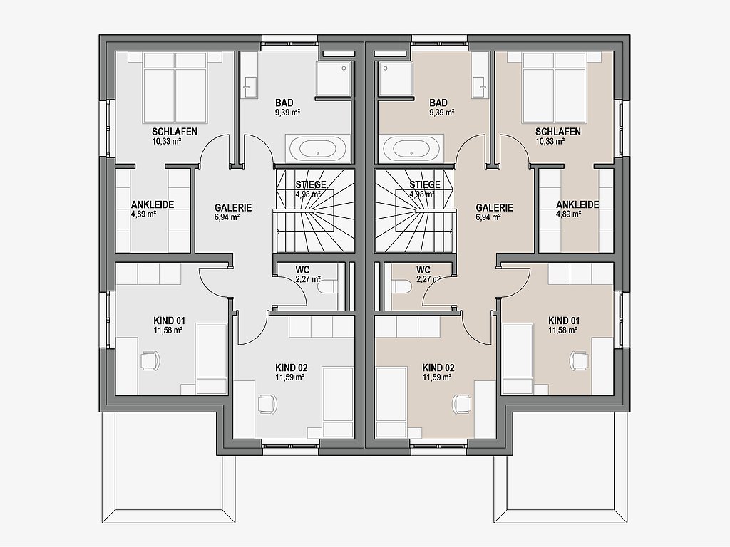 Viele Glas- und Fensterflächen im Erdgeschoß des Doppelhauses 121 leuchten den Wohnraum bis ins letzte Eck aus und erzeugen dadurch ein hohes Maß an Wohnkomfort. Neben dem 58,85 m² großen Untergeschoß bietet das Obergeschoß mit seinen 61,97 m² genügend Platz für drei Schlafzimmer, ein Badezimmer mit Badewanne und ein separates WC.
