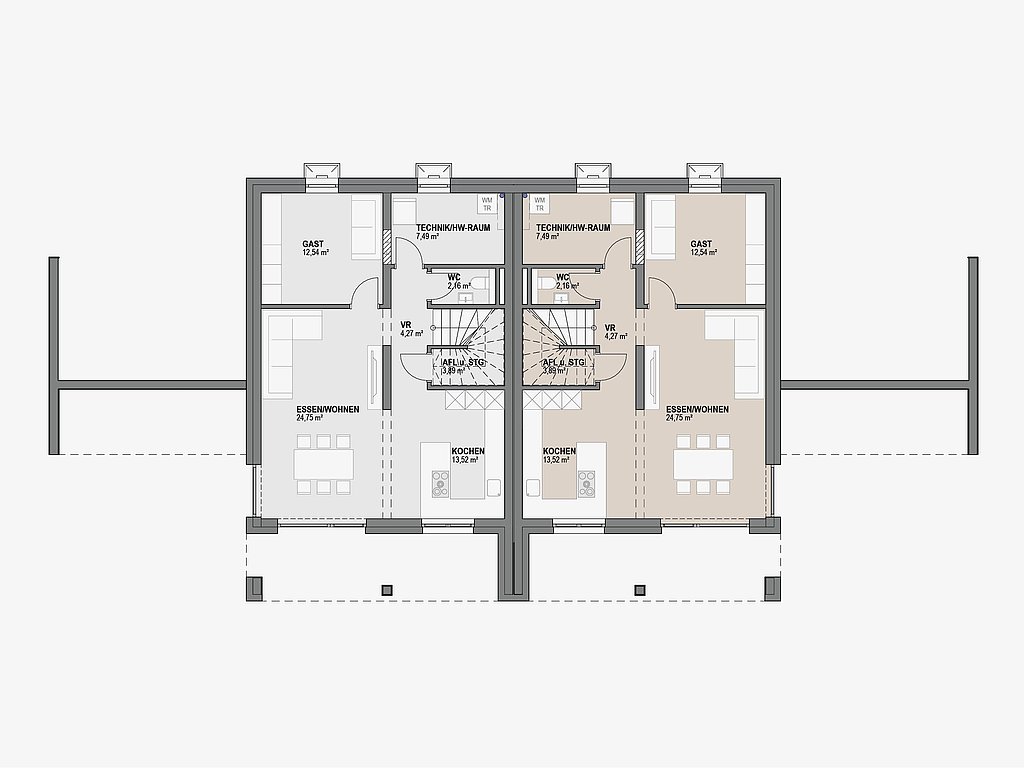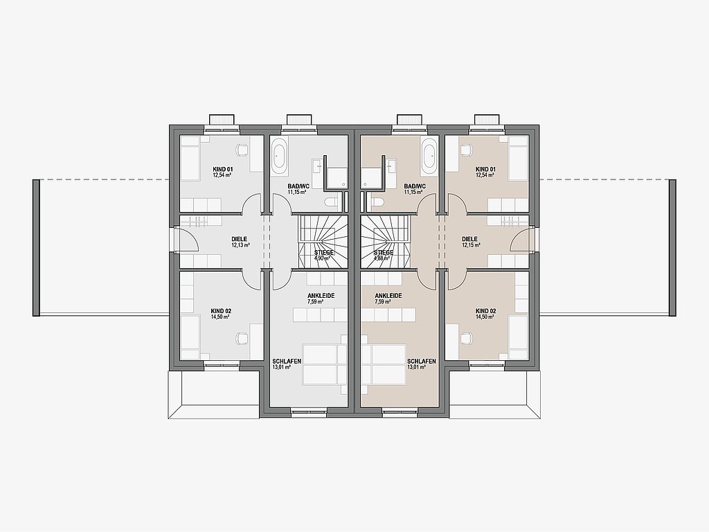 Wenn Sie eine gesellige und umgängliche vierköpfige Familie sind, die vor direkter Nachbarschaft nicht zurückschreckt und ein Haus inklusive Doppelcarport für ein Grundstück mit Hang sucht, könnte das Doppelhaus 141 für Sie die bessere Option als ein Einzelhaus sein. Der Zugang zu jeder Haushälfte ist im Gartengeschoß, welches den offenen Wohn-Ess-Koch-Bereich, das Herzstück jeder Doppelhaushälfte, optimal integriert. Dieser lädt zu gemütlichen Stunden mit der Familie ein. Das Obergeschoß verfügt über zwei Kinderzimmer, ein Schlafzimmer mit Ankleide sowie ein helles Badezimmer. Jede Wohneinheit bietet viele Extras wie ein Gästezimmer und ein Doppel-Carport.