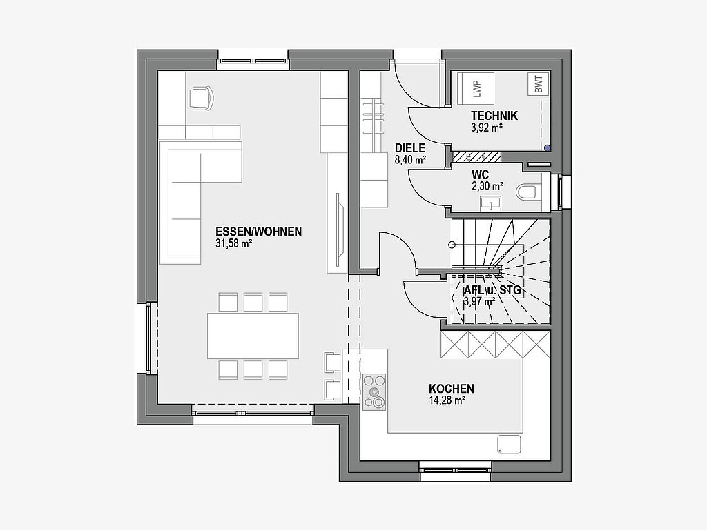 Wenn Sie auf der Suche nach einem modernen und schlichten Ziegelmassivhaus sind, dann haben wir genau das Richtige für Sie im Angebot: Das Typenhaus Graz 125 hat im Erdgeschoß (60,47 m²) eine geräumige Diele, ein Gäste-WC und einen offenen Wohn-Ess-Koch-Bereich, der zu gemütlichen Feiern mit Freunden einlädt.