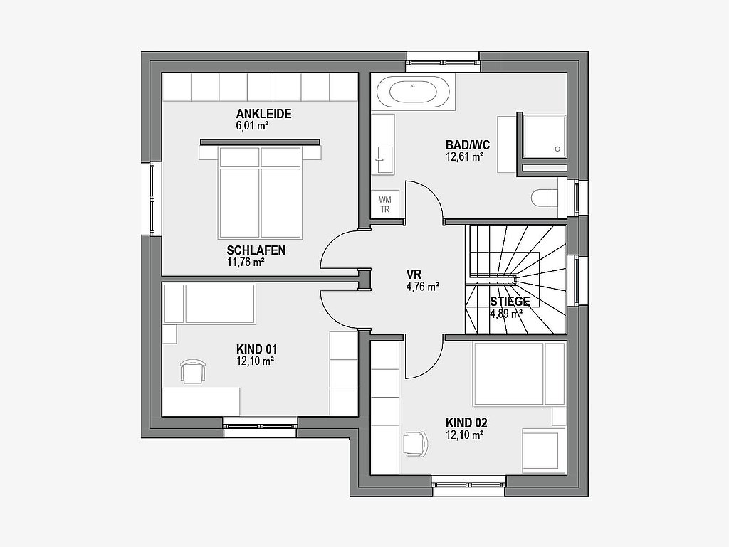 Neben dem offen gestalteten Wohnbereich gibt es auch noch eine überdachte Terrasse, die im Sommer Schatten spendet. Im Obergeschoss (64,22 m²) befindet sich ein Schlafzimmer sowie zwei Kinderzimmer.