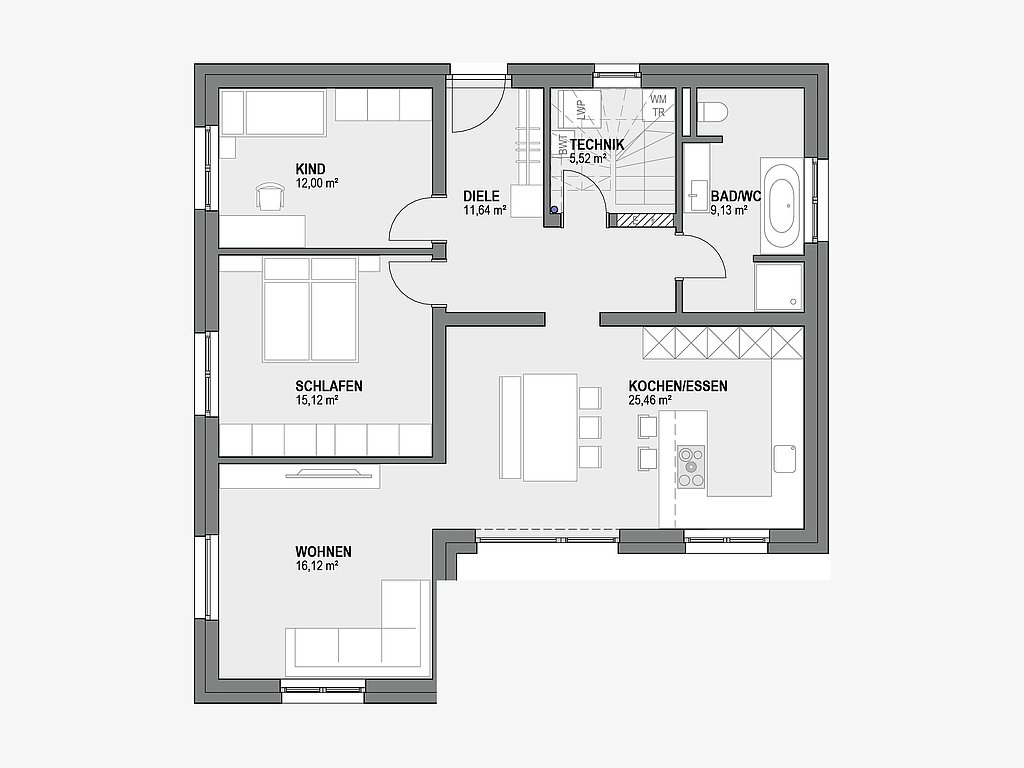 Das Typenhaus Linz 95 lässt für Jemanden, der einen trendigen Bungalow mit wenigen Quadratmetern sucht, keine Wünsche offen. Neben den beiden Schlafzimmern bietet das Haus einen lichtdurchfluteten Wohn-Ess-Koch-Bereich. Der Wohnbereich ist vom Ess- und Kochbereich optisch abgetrennt.