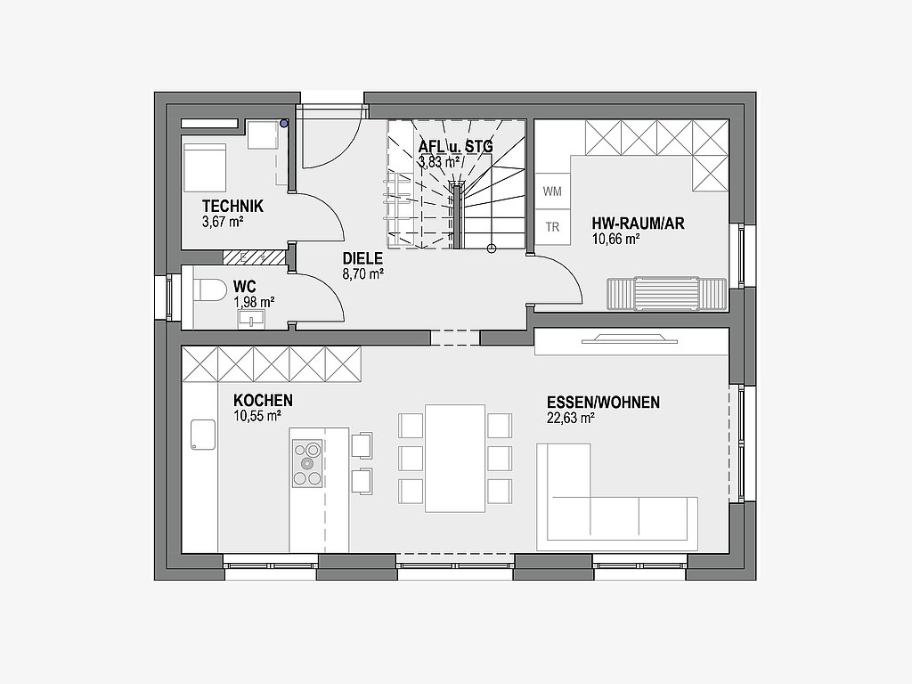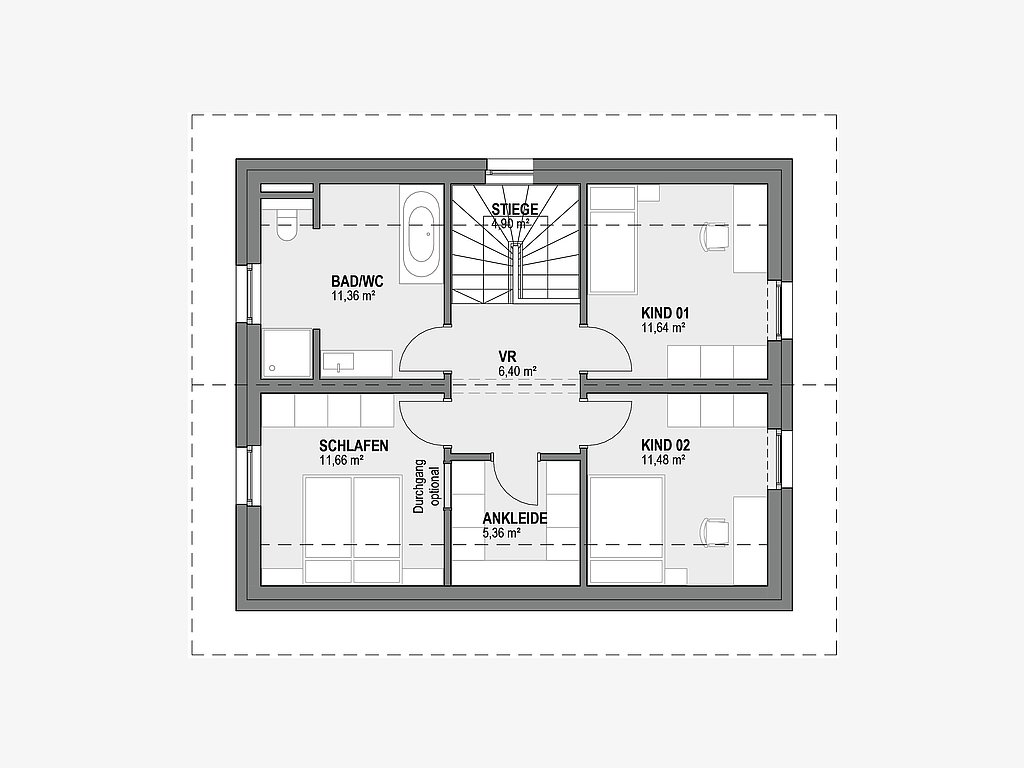 Stil und Design treffen Geborgenheit und Tradition: Das Typenhaus Salzburg 121 überzeugt mit seinem klassischen und zeitlosen Baustil. Mit drei Schlafzimmern im Obergeschoß und einer Wohnnutzfläche von 121,42 m² eignet sich dieses Typenhaus perfekt für eine drei- bis vierköpfige Familie. Eines der Schlafzimmer im Obergeschoß ist mit einer separaten Ankleide ausgestattet und bietet dadurch besonders viel Komfort. Im Erdgeschoß schafft ein zusätzliches Gästezimmer oder Büro flexible Nutzungsmöglichkeiten – ideal für Homeoffice oder Besuch. Für noch mehr Platz in den eigenen vier Wänden kann das Ziegelmassivhaus unterkellert werden.