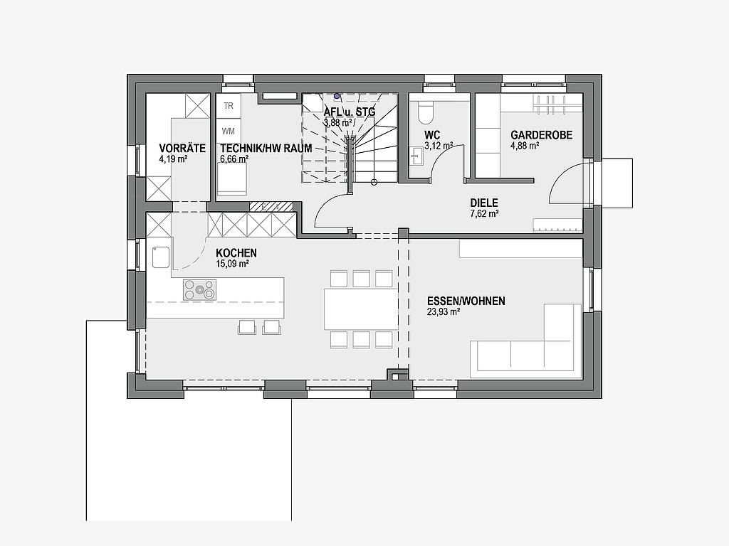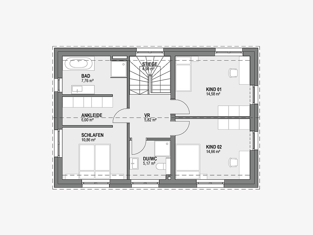 Egal ob Sattel-, Flach- oder Walmdach, mit oder ohne Keller: Das Typenhaus Salzburg 135 lässt keine Wünsche offen. Der großzügige Wohn-Ess-Koch-Bereich ist der Mittelpunkt des Hauses und wirkt einladend aufgrund seiner offenen Gestaltung. Des Weiteren verfügt das Erdgeschoß über ein Gästezimmer und ein Badezimmer mit Dusche und WC. Im 69,73 m² großen Obergeschoß finden ein Master-Bedroom mit eigenem Bad und zwei Kinderzimmer ihren Platz.