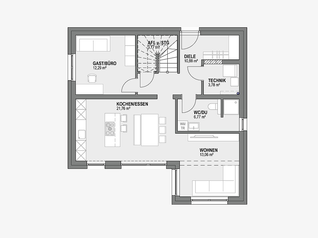 Mit dem Typenhaus St. Pölten 135 wird Haus bauen zum Kinderspiel. Das Ziegelmassivhaus wird mit österreichischen Markenprodukten erbaut. Dieses Haus bietet Ihnen alles, was Sie sich von den eigenen vier Wänden wünschen und ist trotz allem noch leistbar. Der kostenoptimierte Grundriss im Erdgeschoß bietet mehrere Highlights. Zum einen eine offene Küche mit anschließendem Ess- und Wohnbereich und zum anderen ein Gästezimmer und ein Bad mit WC. Im Obergeschoß können Sie im Badezimmer relaxen und abschalten. Das Schlafzimmer und die Kinderzimmer bieten mit 12,29 bis 12,81 m² Privatsphäre und Ruhe.