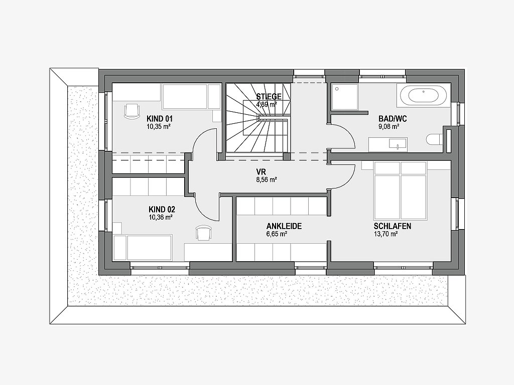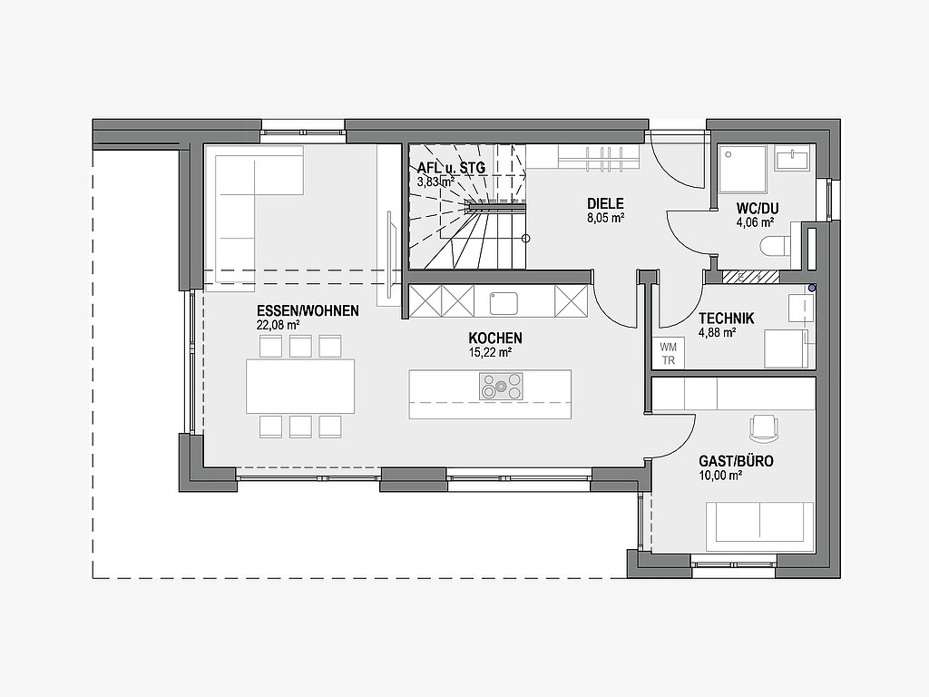 Das schlichte und dadurch moderne Design des Typenhauses Wien 128 begeistert Jung und Alt! Auf 127,88 m² finden Sie die offen gestaltete Küche, die bei jedem Chefkoch der Familie das Herz höher springen lässt. Das angrenzende Gästezimmer bzw. Büro bietet zusätzliche Flexibilität für Arbeit, Besuch oder Hobby. Im Obergeschoß finden Sie zwei Kinderzimmer sowie ein Schlafzimmer mit eigenem Ankleidebereich.