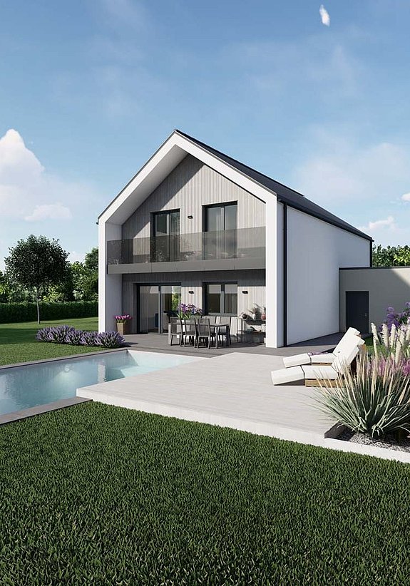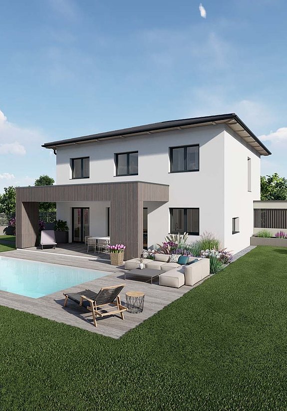 Unsere Typenhausserie Graz ist ideal fĂŒr eine mehrköpfige Familie. Neben dem offen gestalteten Wohn-Ess-Koch-Bereich sorgen lichtdurchflutete RĂ€ume fĂŒr WohlfĂŒhlatmosphĂ€re in den eigenen vier WĂ€nden. Die kompakte Form vereint flexible Innenraumgestaltung mit optimierten Kosten. FĂŒr mehr Stauraum lĂ€sst sich das Haus natĂŒrlich auch unterkellern.